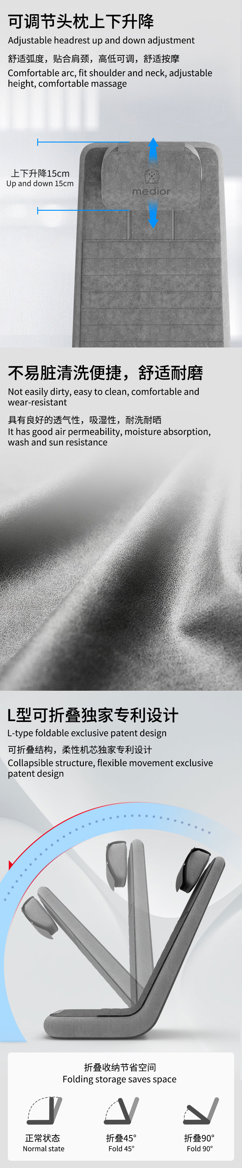 1、L型機芯結(jié)構(gòu),對折包裝縮小體積2、獨家專利柔性機芯3、力度三檔調(diào)節(jié),頸部揉捏,定點按摩,腰背按摩、臀腿按摩、全背按摩模式選擇4、頸部背部行走揉捏,按摩區(qū)域加長到從肩膀到大腿;5、更加貼合不同款式的椅子整體可對折收納6、亞馬遜標準包裝尺寸